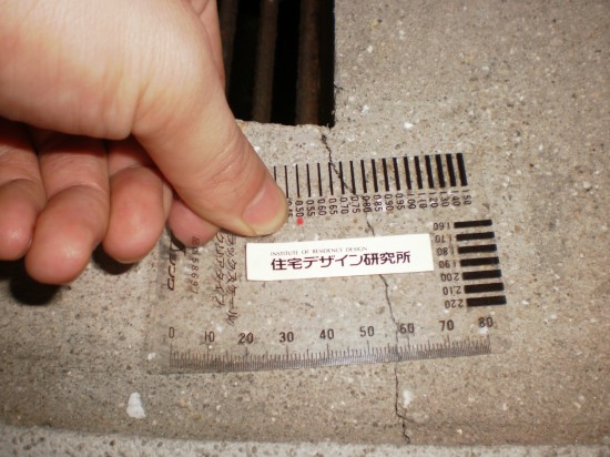 ↑ 基礎のクラックの幅を調べています。だいたい幅が0.5mm以内であれば問題ありません。