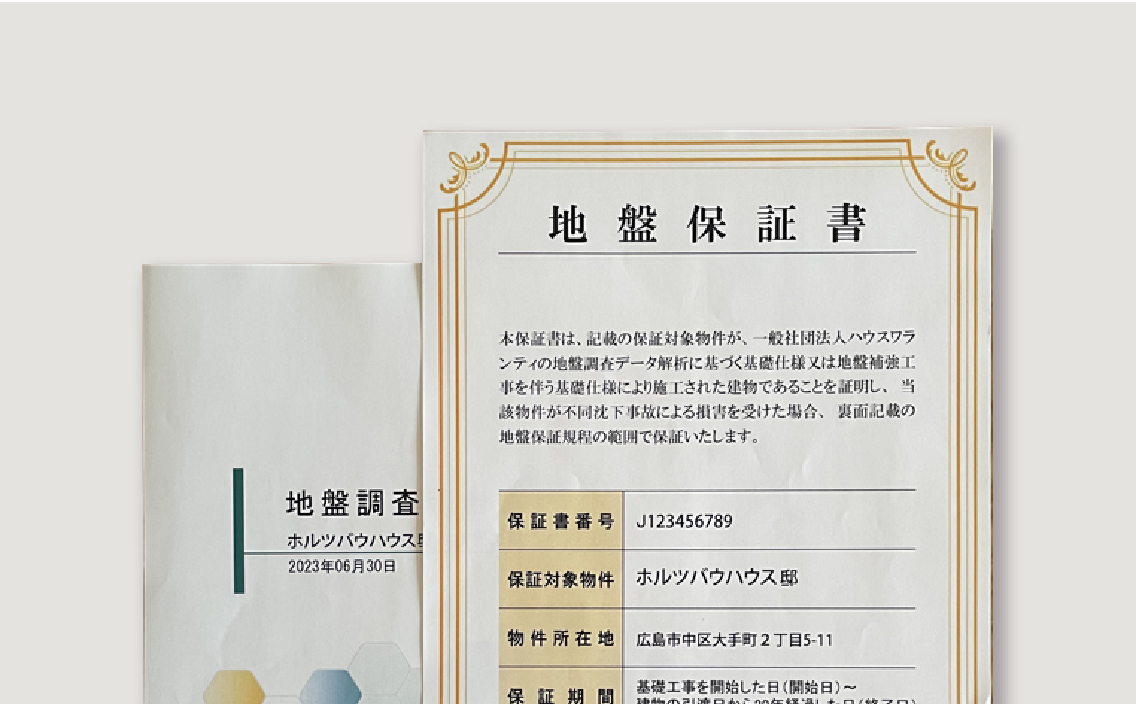 地盤調査や基礎の設計・施工が原因により家が傾いたときに、着工日から20年間、損害費用を補償します。