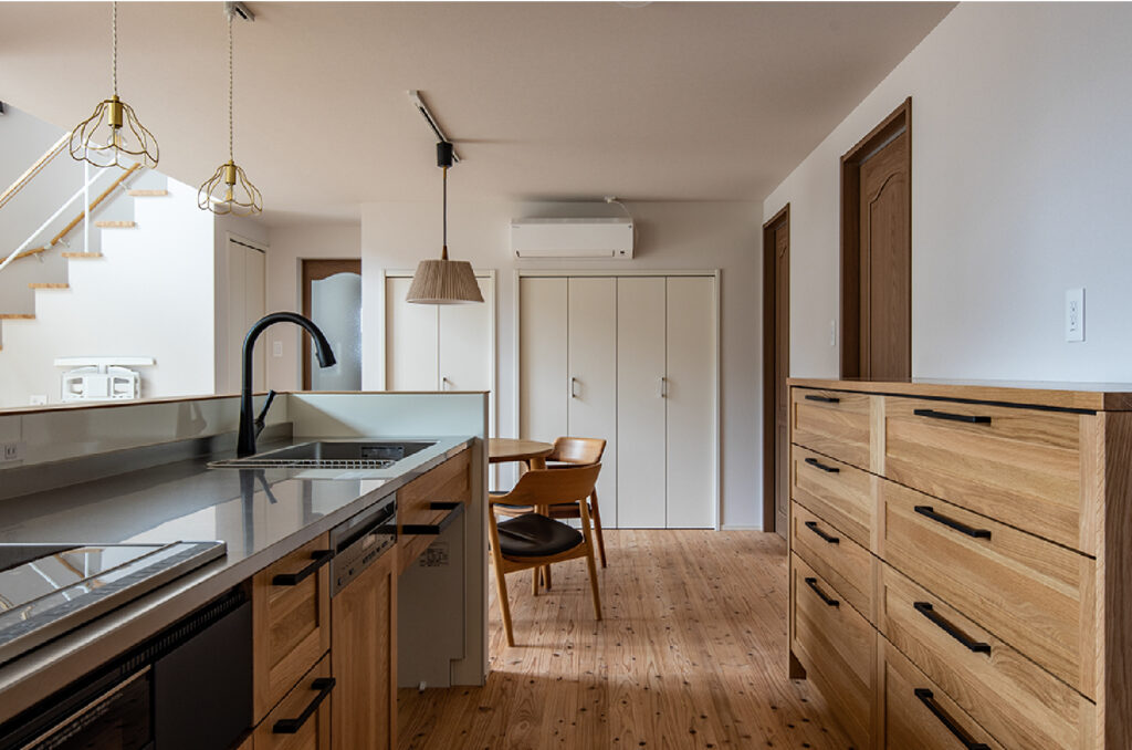 無垢の床に合わせて、オークの面材のキッチンカウンターを設置。