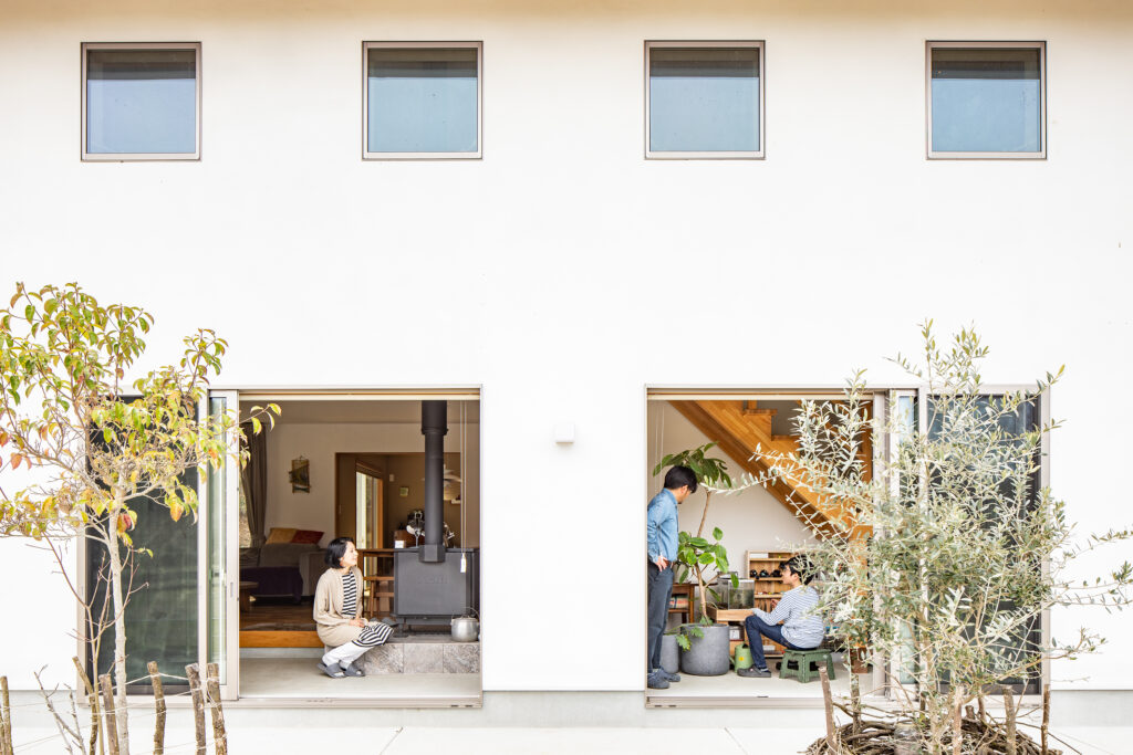 家づくりの舞台は、奥さまのお祖母さまの家があった豊かな里山。街中での集合住宅での暮らしが手狭になってきた頃、懐かしい思い出の地に家族の新たな拠点をつくることになりました。外遊びが好きなご家族。それぞれが日々の暮らしの中に小さな学びを見つけられる、自然と心に寄り添った住まいを目指しました。住まいのこだわりは「ひとつながり」であること。家族の気配を感じながら、なるべく扉を開けて生活ができるように引戸で統一しています。冬には薪ストーブの暖かさが家中を包み込みます。