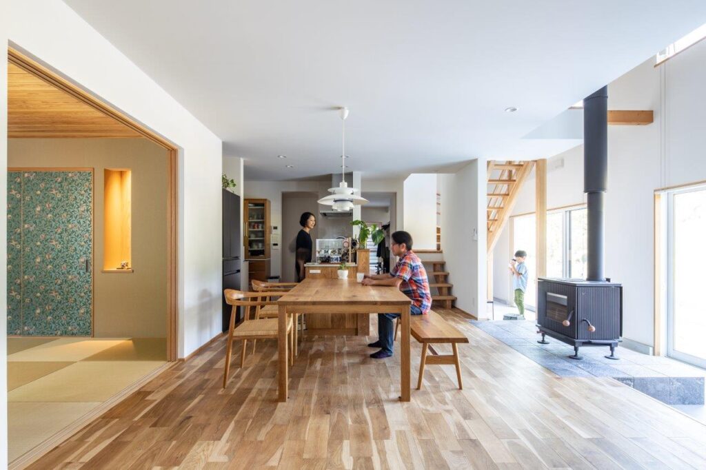 薪ストーブのある広々としたLDK。窓に面した場所は土間が奥まで続いており、農作業や外遊びから帰ってきた時にも便利。来客が多いこの空間の床には、強硬なオークを使用して暮らす人も訪れる人も気兼ねなくのんびりとした時間を過ごせるように。