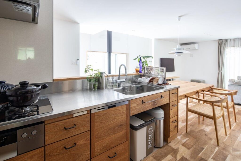 面材にナラ材を使用したカウンターは、家具のように使えば使うほど味わいが深まります。