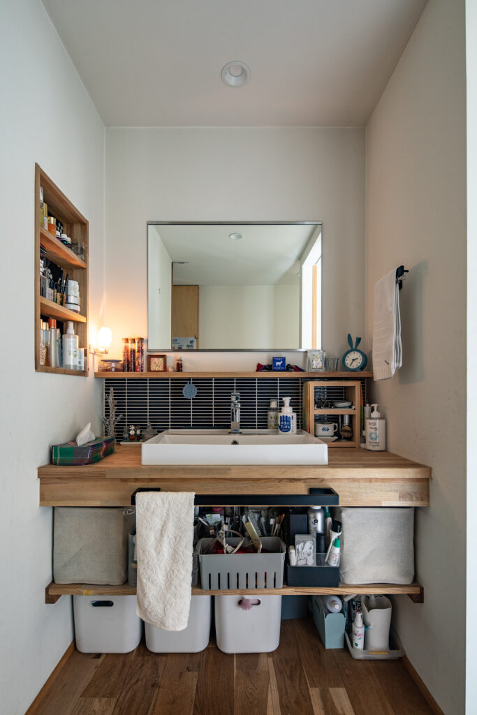 廊下に配置した洗面台は無垢材で造作。ご家族の使い勝手はもちろん、ゲストにも使ってもらえるように魅せる洗面台に。
