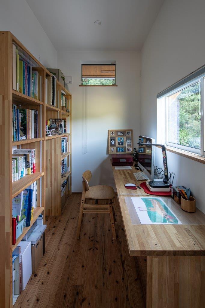 ご主人の書斎。デスクと棚は樹種を揃えて造作したもの。