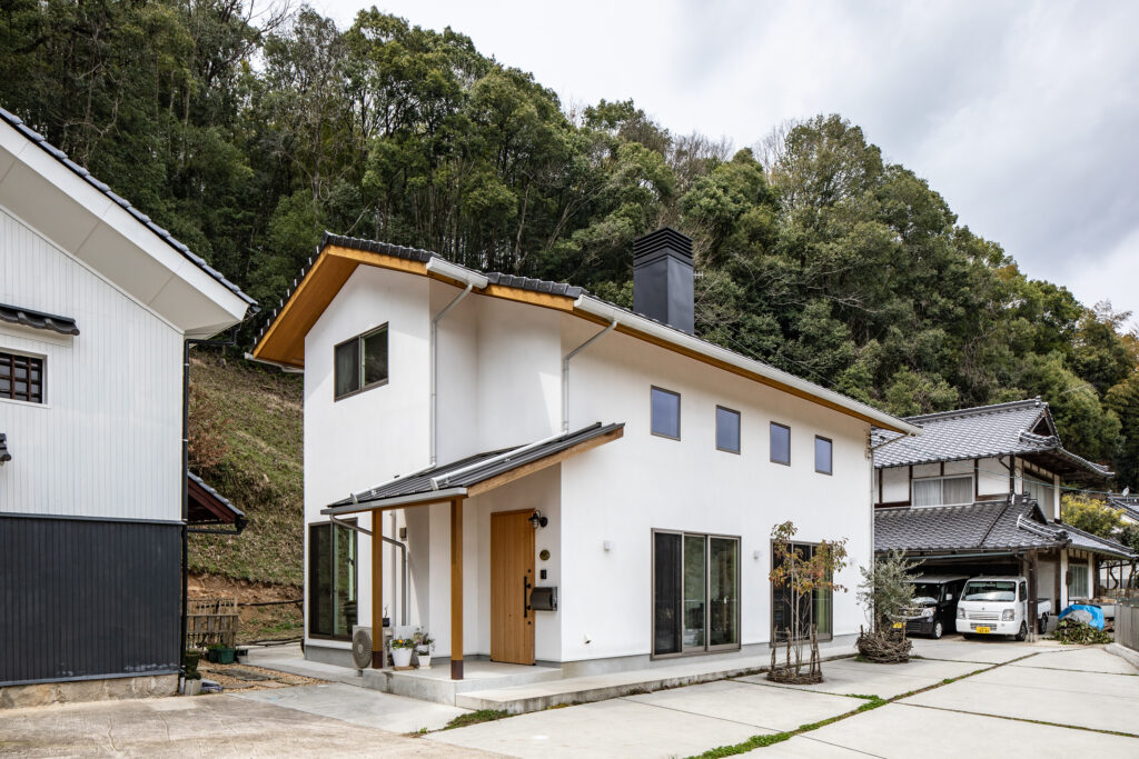 家づくりの舞台は、奥さまのお祖母さまの家があった豊かな里山。街中での集合住宅での暮らしが手狭になってきた頃、懐かしい思い出の地に家族の新たな拠点をつくることになりました。外遊びが好きなご家族。それぞれが日々の暮らしの中に小さな学びを見つけられる、自然と心に寄り添った住まいを目指しました。住まいのこだわりは「ひとつながり」であること。家族の気配を感じながら、なるべく扉を開けて生活ができるように引戸で統一しています。冬には薪ストーブの暖かさが家中を包み込みます。